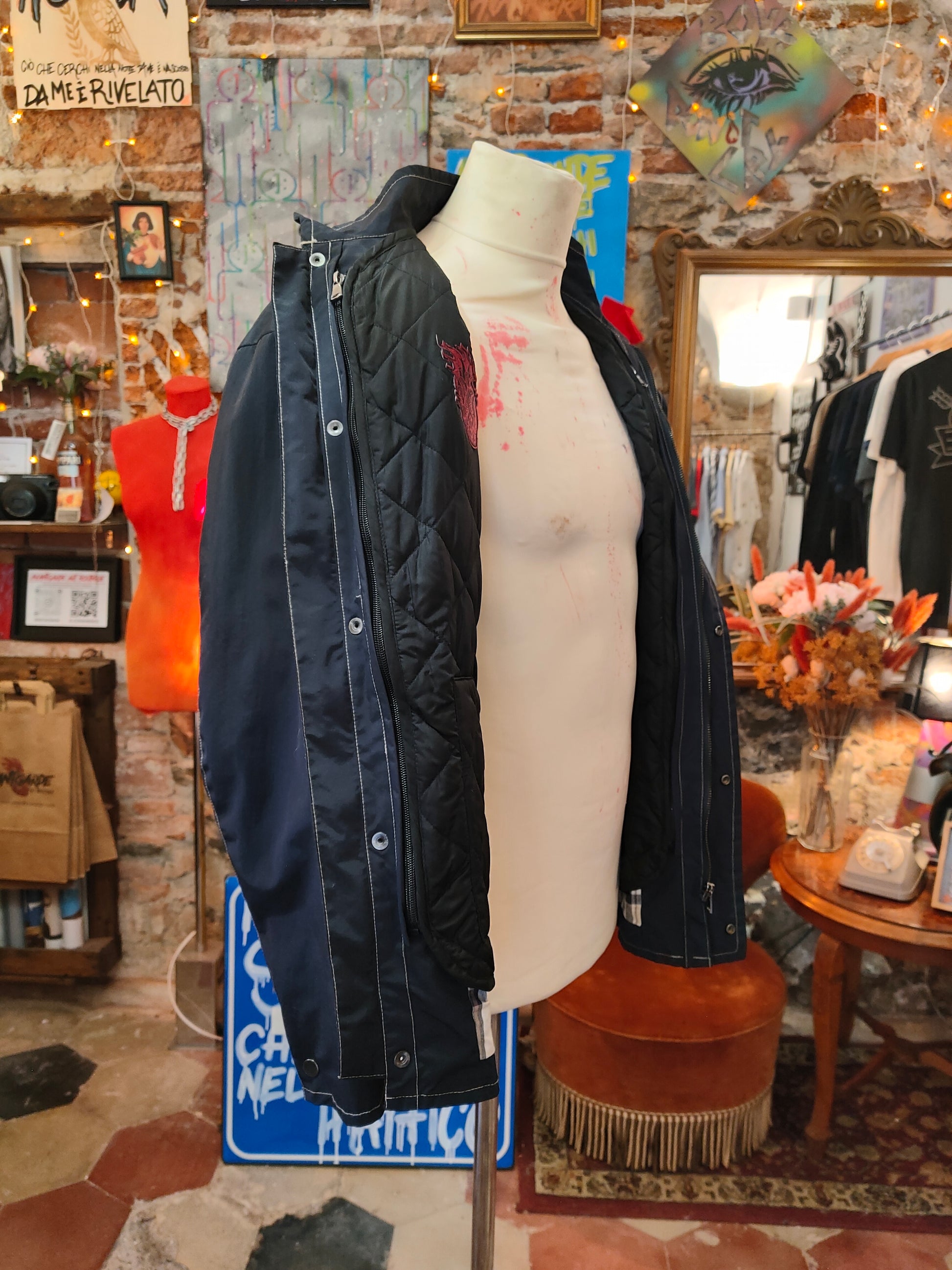 Questo pezzo unico è stato rigenerato a mano attraverso un processo di upcycling radicale: interventi artistici, tagli sartoriali e contaminazioni materiche rendono ogni dettaglio irripetibile.