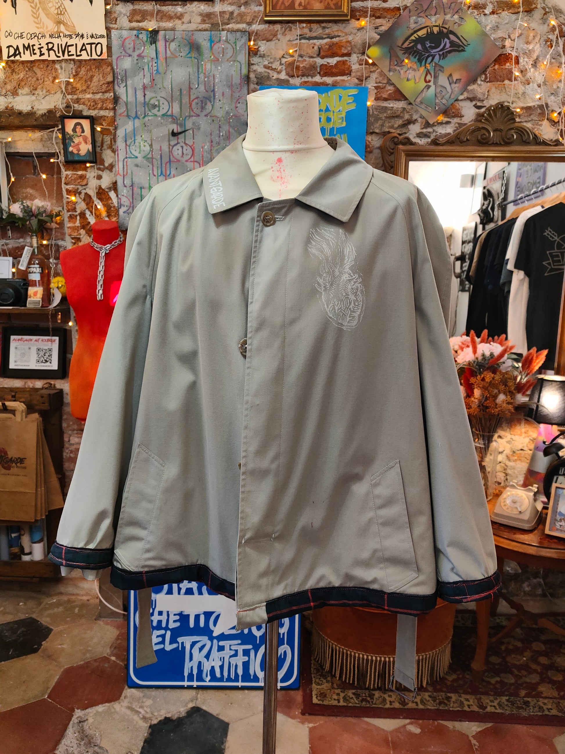 Questo pezzo unico è stato rigenerato a mano attraverso un processo di upcycling radicale: interventi artistici, tagli sartoriali e contaminazioni materiche rendono ogni dettaglio irripetibile.